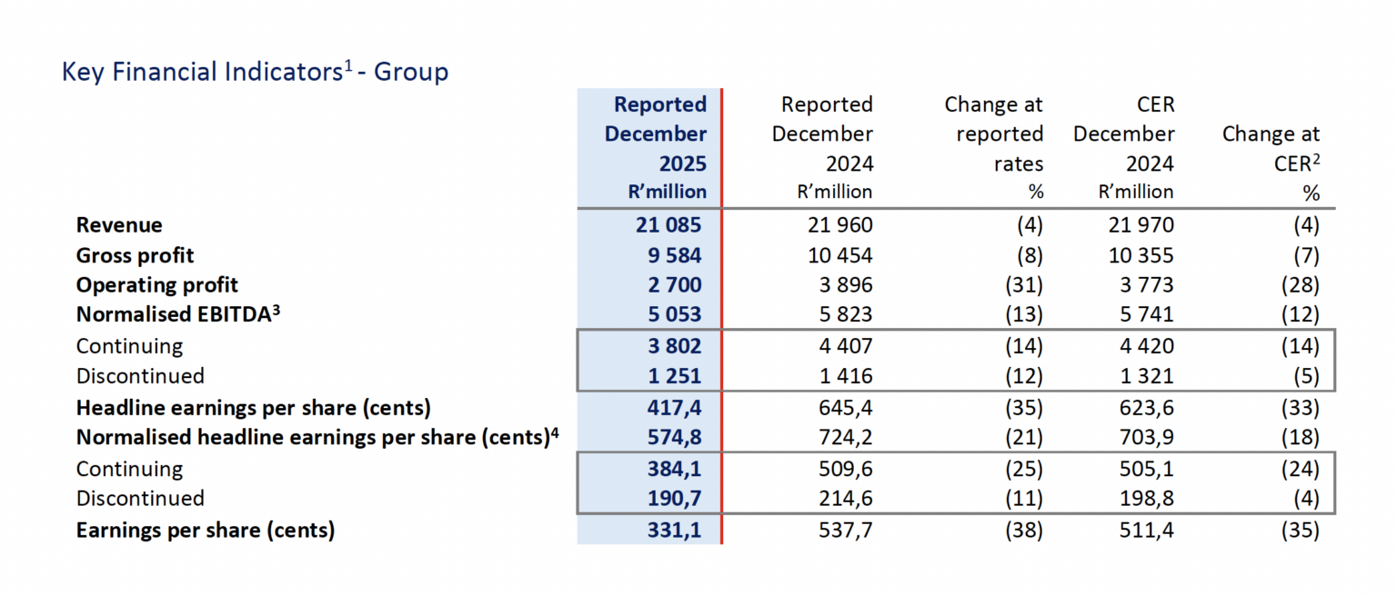 During the six months ended 31 December 2025 (“H1 2026”) the Group focused on the execution of its strategic priorities as communicated to stakeholders in a SENS announcement published on 29 December 2025 and during the stakeholder engagement call held on 15 January 2026. The Group delivered an encouraging performance for H1 2026 supported by the continued strong momentum in Commercial Pharmaceuticals and solid progress in reshaping its sterile FDF Manufacturing facilities in South Africa and France. One-off restructure costs of R695 million relating to these sterile FDF Manufacturing facilities have been incurred in H1 2026 and have negatively impacted earnings per share (“EPS”) and headline earnings per share (“HEPS”). H1 2026 should be viewed as transitional with stronger relative performance anticipated in the second half of FY 2026, as the benefits of operational improvements and the reshaping within Manufacturing are progressively realised.