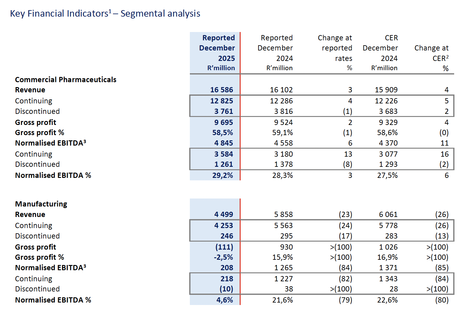Manufacturing revenue of R4 499 million ended 23% lower (-26% CER) and normalised EBITDA of R208 million declined by 84% (-85% CER) primarily due to the absence of the prior period mRNA contribution.